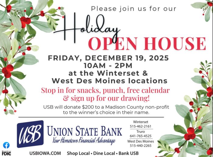Our friends (and sponsors!) at Union State Bank invite you to join them for some holiday cheer this Friday. Visit any of the three USB location—Winterset, West Des Moines, & Truro—for snacks, punch, free calendars and a drawing for $200 to a non-profit of your choice!