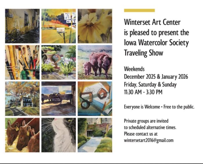 The Winterset Art Center is hosting a wonderful exhibit of the Iowa Watercolor Society through December and January. The exhibit is open Fridays, Saturdays and Sundays from 11:30am – 3:30pm.