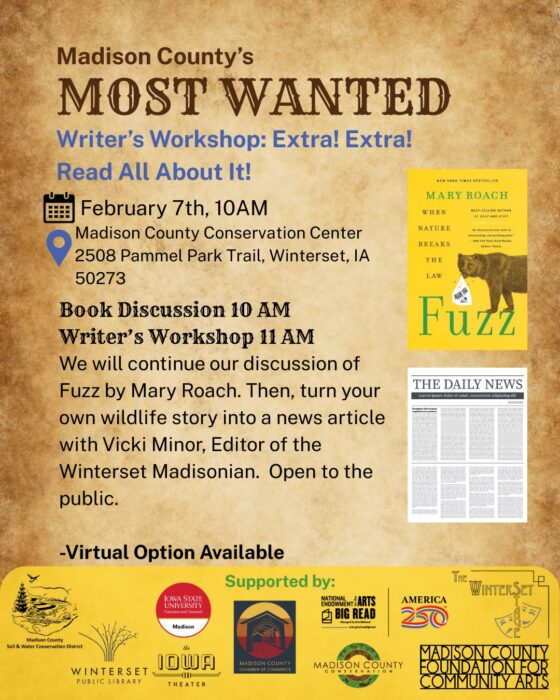 This writer’s workshop is the latest event in the year-long exploration of Madison County’s Most Wanted (animals) and the book Fuzz by Mary Roach. Turn your own wildlife story into a news article with Vicki Minor, Editor of the Winterset Madisonian. Open to the public. Virtual option available.