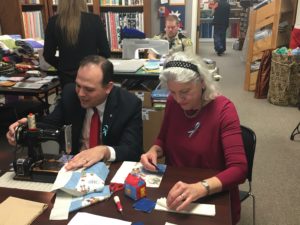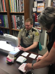 Madison County Sheriff Jason Barnes, Winterset Police Chief Ken Burk, Madison County Attorney Matt Schultz, Iowa Attorney General Tom Miller and several others put their hands to work yesterday and completed nearly five quilt tops. These tops will be turned into finished quilts by the skilled Joyce Franklin, Tony Jacobson and the staff at Piece Works Quilt Shop.