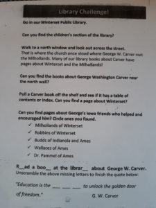 The Winterset Public Library is partnering with the “Exploring is Cool!” Little Library Challenge Project by adding a “Footsteps of Carver” Reading Challenge that features the story of George W. Carver. Kids can get the new “Footsteps of Carver” Challenge sheet at the Public Library in the “Explore Madison County” Exhibit or at one of two Little Free Libraries at W. Jefferson & 4th Ave. or E. Court & 5th St.
