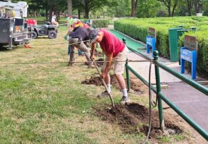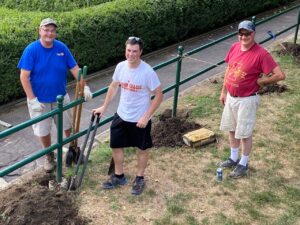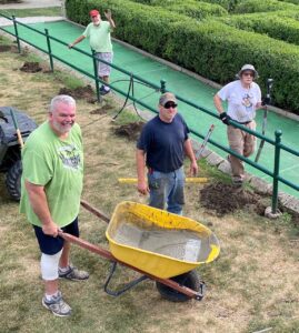 Our local Rotarians recently organized a work crew for straightening the posts on the railing overlooking the Rotary Hedge Maze in city part. The team dug dozens of holes then evenly pulled the posts to plumb and mixed concrete to set around the posts bases.