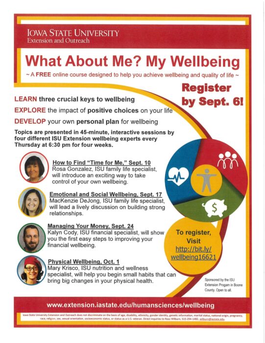 The Iowa State Extension Service is proving an opportunity for citizens to engage in hands-on learning to enhance your wellbeing and quality of life in ways that are personally meaningful to you. In the four sessions, which will take place on Thursday evenings starting September 10th, learn strategies for taking time for yourself, building relationships, and improving physical and financial health.