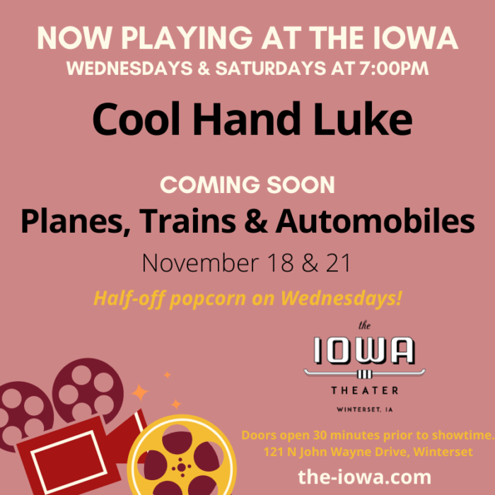 The Iowa is moving to a winter schedule and will be showing movies only on Wednesdays and Saturdays at 7:00pm