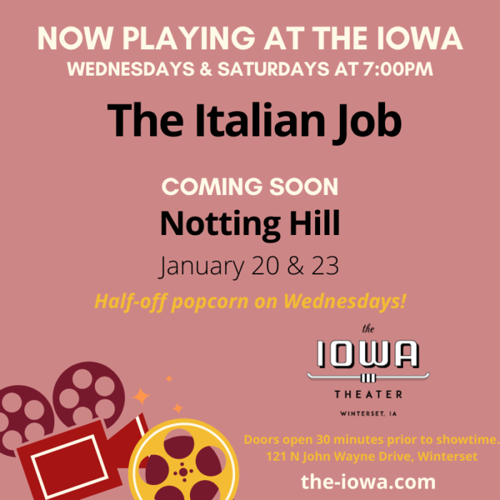 All month long the Iowa Theater is ready to take you traveling with location-themed movies like The Italian Job, Notting Hill, and The Lady from Shanghai. Who says we can’t go places?!