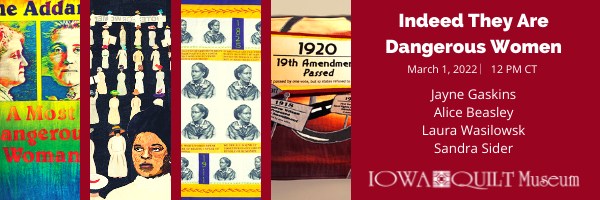 Meet four more quilt artists from our “Deeds Not Words: Celebrating 100 Years of Women’s Suffrage” exhibit during this online gallery walk with the Iowa Quilt Museum. Keep learning about these “dangerous women” and their roles in women’s suffrage along with the journey of each artist in depicting their topics.