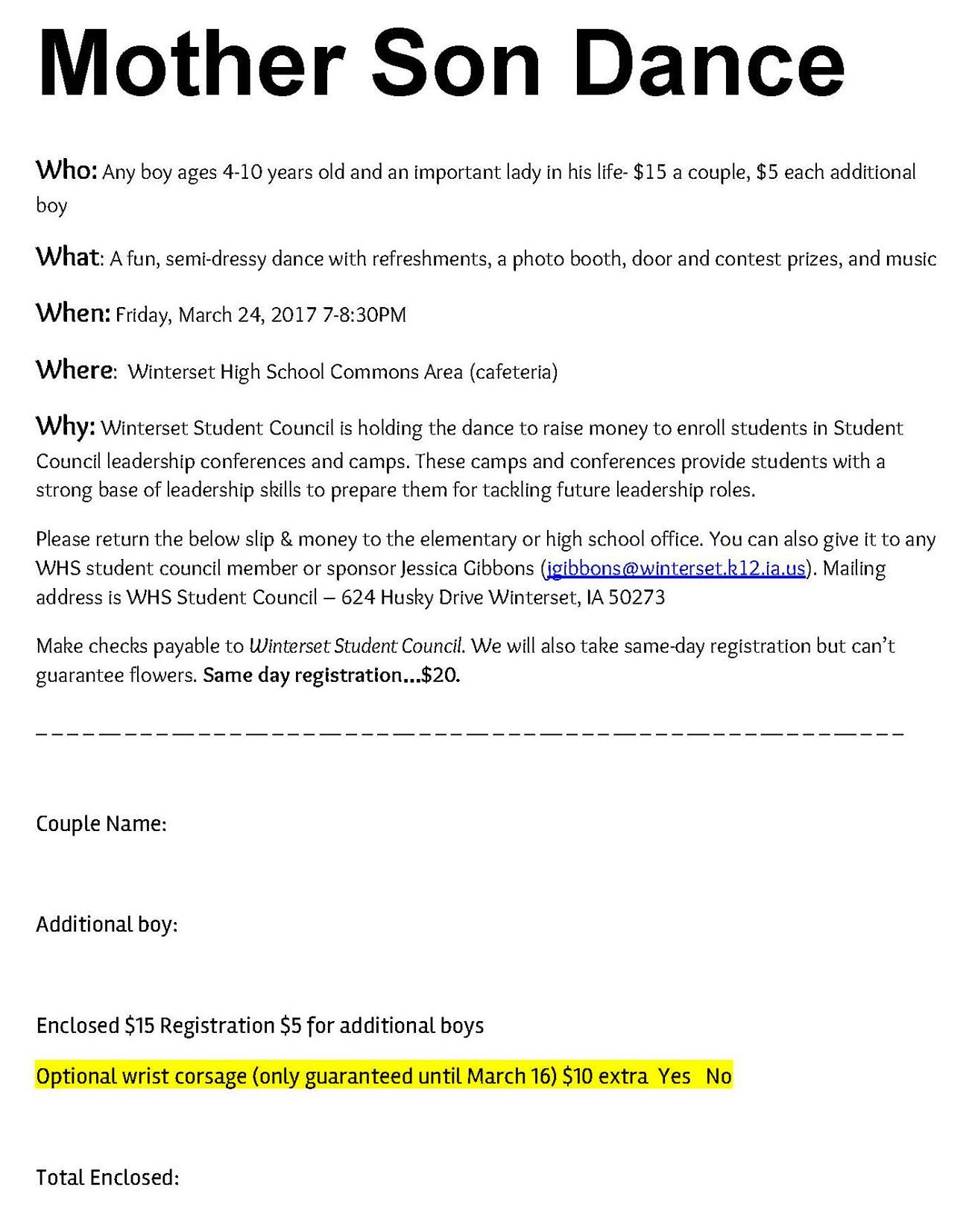 The Winterset High School Student Council is hosting a Mother Son Dance on March 24th from 7:00 to 8:30 pm in the WHS commons/cafeteria. Click here to download a copy of this sign-up form and return it to the mailing address listed on the form.