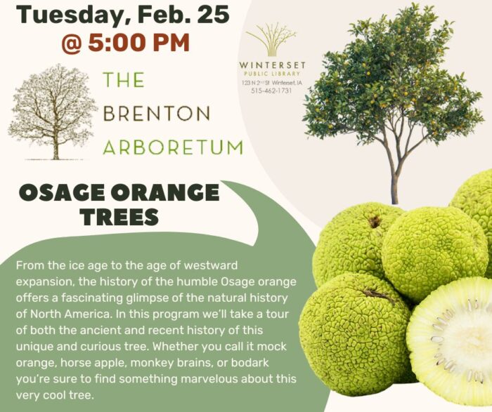 From the ice age to the age of westward expansion, the history of the humble Osage orange offers a fascinating glimpse of the natural history of North America. In this program we’ll take a tour of both the ancient and recent history of this unique and curious tree. Whether you call it mock orange, horse apple, monkey brains, or bodark, you’re sure to find something marvelous about this very cool tree. This program is free and open to all, no registration required.